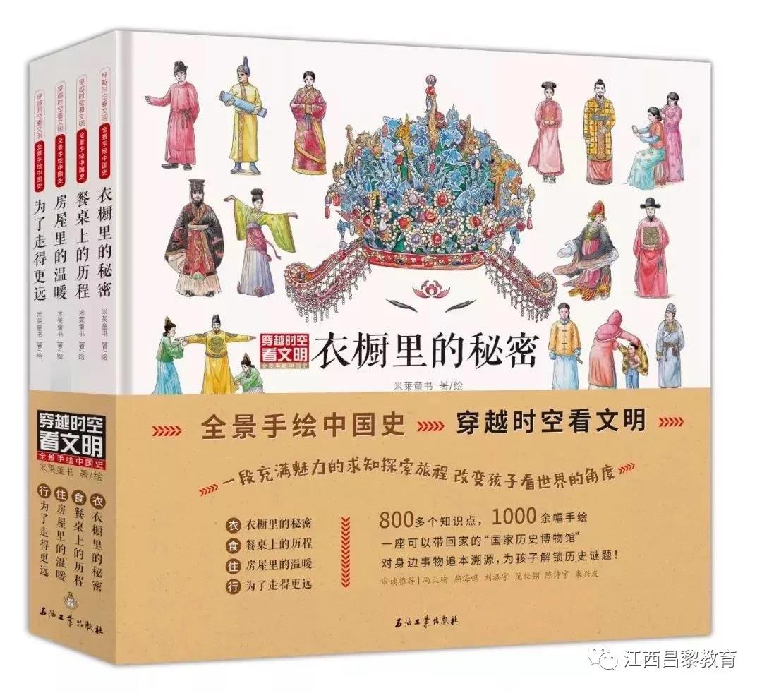 這套書(shū)共4冊(cè),分別以衣、食、住、行作為素材,發(fā)掘歷史的脈絡(luò),嘗試在中國(guó)史的巨大框架下,從身邊的事物出發(fā),通過(guò)嚴(yán)謹(jǐn)?shù)目紦?jù),寫(xiě)實(shí)有趣的繪畫(huà),細(xì)膩生動(dòng)的敘述語(yǔ)言,從還原真實(shí)場(chǎng)景的角度,敘述中國(guó)歷史的發(fā)展與變遷,展示中華民族的悠久歷史和燦爛文化。