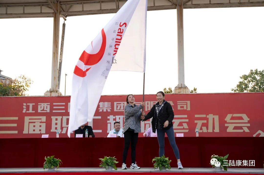 本屆運動會承辦單位江西君健實業有限公司總經理曹敘婷女士,將運動會會旗移交至下一屆承辦方新能源事業部,由總經理助理唐舟女士接受會旗。