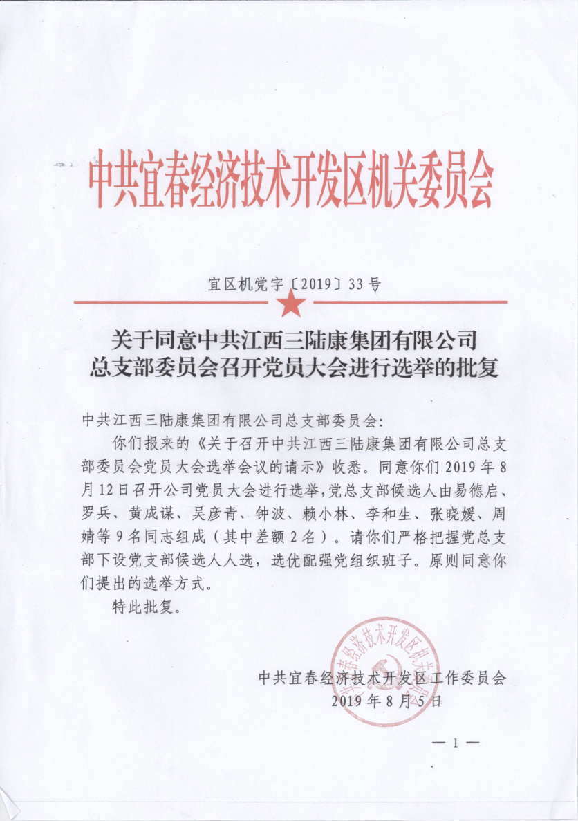 江西三陸康集團(tuán)有限公司成立于2004年,自成立以來,始終堅(jiān)持以黨的路線方針引領(lǐng)企業(yè)發(fā)展,2019年8月5日,中共宜春經(jīng)濟(jì)技術(shù)開發(fā)區(qū)機(jī)關(guān)委員會(huì)下發(fā)《關(guān)于同意中共江西三陸康集團(tuán)有限公司總支部委員會(huì)召開黨員大會(huì)進(jìn)行選舉的批復(fù)》,江西三陸康集團(tuán)黨總支正式獲得批復(fù),為集團(tuán)黨建工作掀開新的篇章。